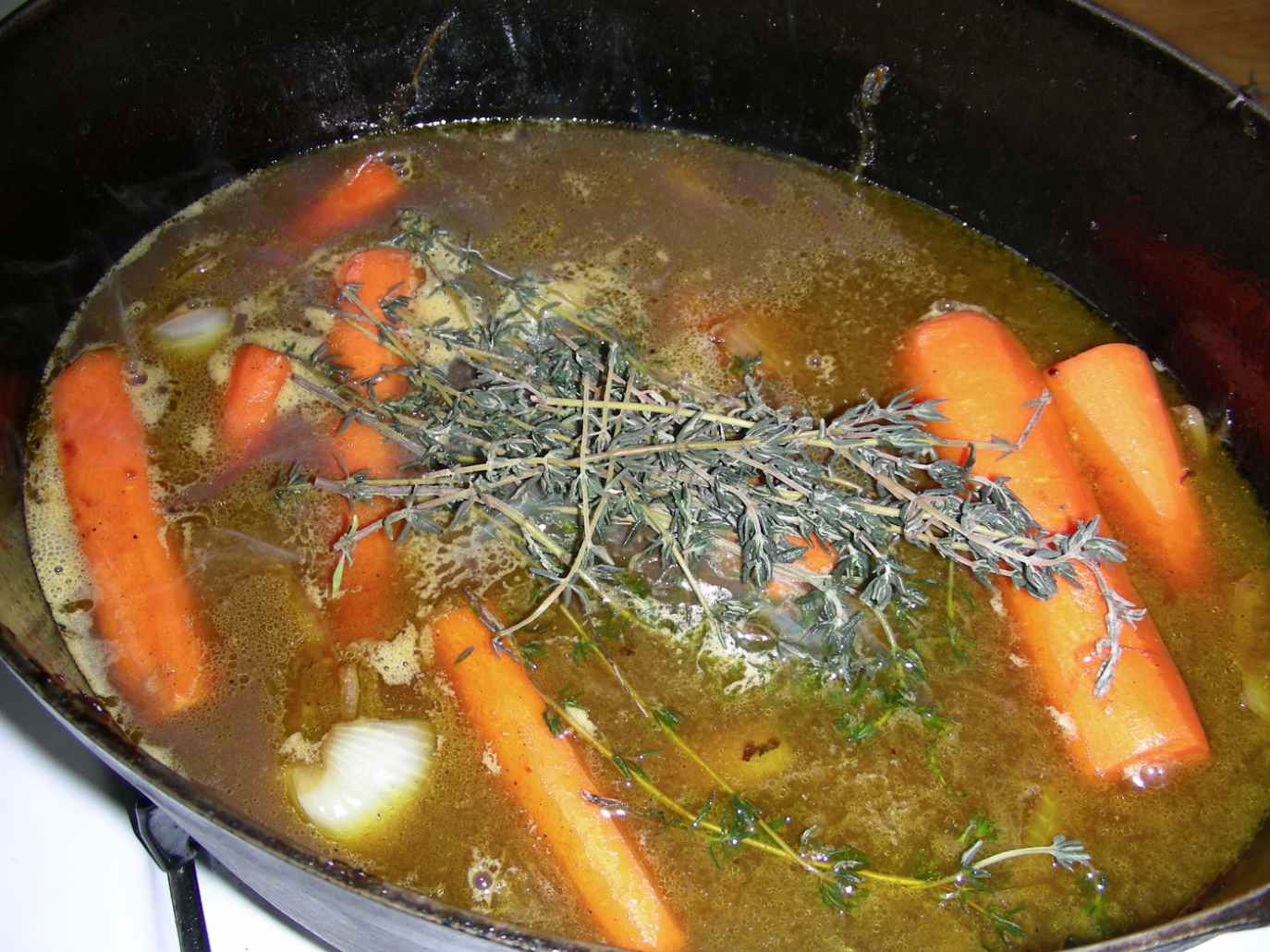 While the stock is simmering, put a half dozen strips of bacon into a heavy dutch oven that has a tight fitting lid and fry the bacon uncovered until it’s crisp.
