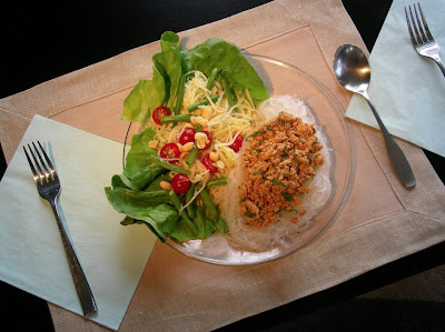 Green papaya salad with raw green beans, cherry tomatoes and roasted peanuts.
